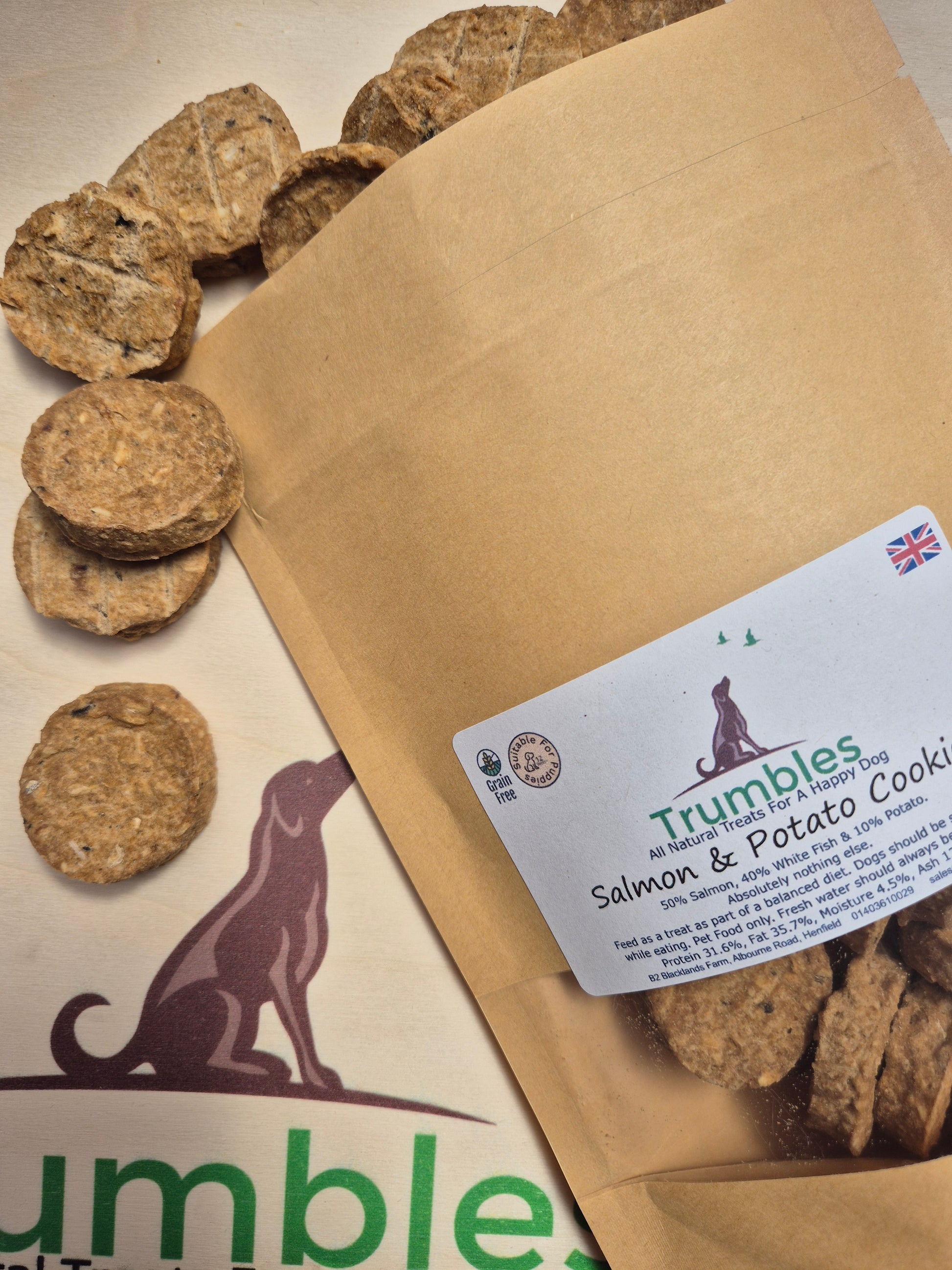 Our Salmon & Potato Cookies are made from 100% natural ingredients. These delicious healthy treats are made from just three ingredients, with no nasty added colours or additives. Packed full of Omega 3 and vitamins these healthy treats are delicious and nutritious.